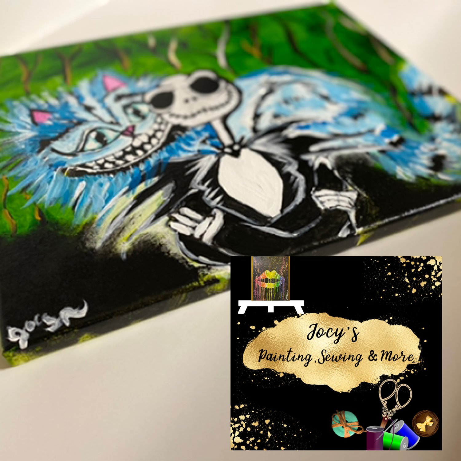 The painting Canvas “Cheshire Cat & Jack Skellington”. The size is 11x14. It is perfect for who love Alice in Wonderland and Jack Skellington! It is perfect for home decor, bedroom, office or other!
